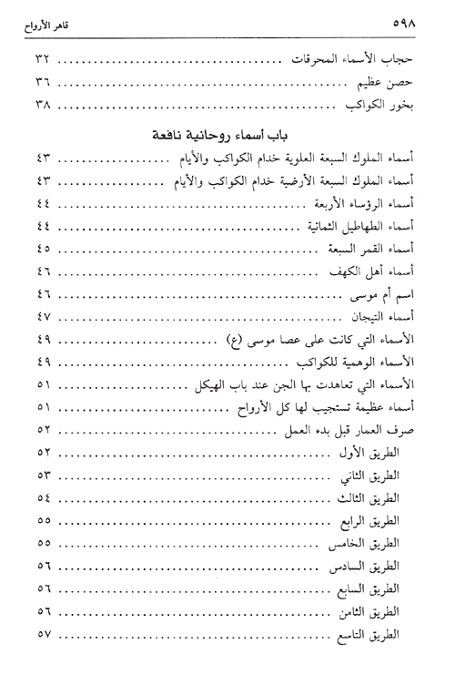 وفي باب الأسماء الروحانية النافعة ينبه المؤلف إلى أن من الأمور التي تجب لطالب هذه العلوم أن يكون عارفاً بأسماء الملوك والرؤساء الروحانيين، و هم الذين يقسم بهم على الأعوان في الأعمال. وكلما كان مبجلاً لهذه الأسماء وعظم قدرهم. وهؤلاء الملوك هم: روقيائيل، جبرائيل، سمسمائيل، ميكائيل، صرفيائيل، غيائيل، كسفيائيل، ولكل يوم من أيام الأسبوع ملك مكلف به.
