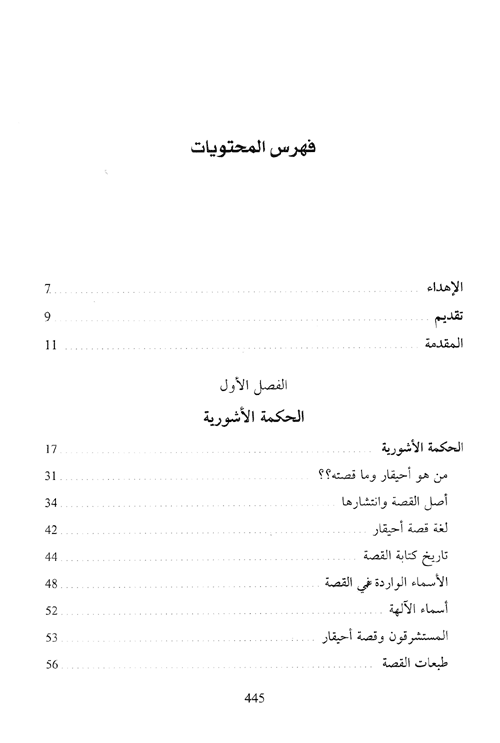 قسمنا البحث إلى خمسة فصول إضافة إلى المقدمة والملاحق. الفصل الأول، وتناولنا فيه "الحكمة الآشورية" وعصر "أحيقار الحكيم" مع التعريف بشخصه وقصته. الفصل الثاني، وأوردنا فيه النص الآرامي، والنص السرياني بعد تعريبهما، ثم مقابلة قصيرة بين النصين. الفصل الثالث: وتحدثنا فيه عن حكمة أحيقار، أولها وتشابيهها وأمثالها والأساطير التي وردت فيها.