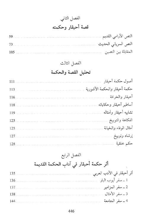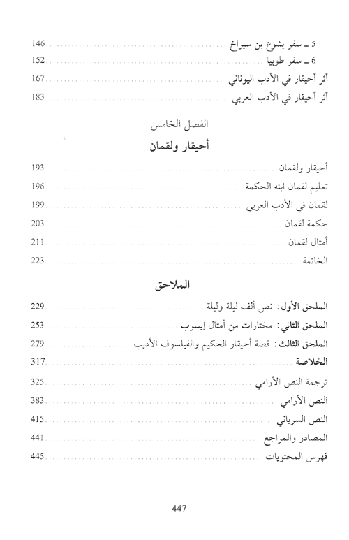 الفصل الرابع: وفيه بينا أثر حكمة أحيقار في آداب الحكمة القديمة، في الأدب العبري، والأدب اليوناني، ثم الأدب العربي. أما الفصل الخامس: فقد تناولنا فيه الكلام على أحيقار الآرامي ولقمان العربي، وحكمته وأمثاله. ثم جعلنا للبحث خلاصة بمثابة خاتمة وافية حيث أدرجنا فيها أهم النتائج التي خرجنا بها. وأردفنا بعد ذلك البحث بأربعة ملاحق زيادة في الإيضاح والفائدة للقارئ الكريم. إقرأ المزيد