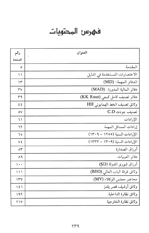 ولكي يتيسر على الباحثين فهم تشكيلات الدولة العثمانية وللاستفادة من الوثائق، فقد قمنا بشرح موجز لكل مجموعة من الوثائق التي تم إعداد ملخص لها. مما يوضح للباحث موضع أي وثيقة ويسهل عليه القيام بأبحاث إضافية لو احتاج الأمر لذلك، ولقد تم إعداد الدليل وفقاً لمجموعات رئاسة الوزراء للأرشيف العثماني ولمي صنف تصنيفاً مختلفاً.