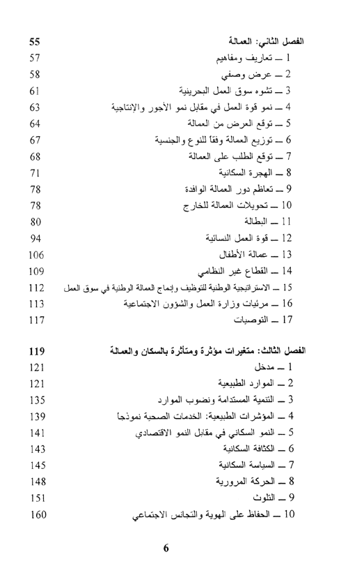 نبذة الناشر:يسعى في فصوله الستة، إلى محاولة الكشف عن الواقع الراهن للسكان في مملكة البحرين، وتوزيع العمالة على الفئات العمرية بين المواطنين والمقيمين من الذكور والإناث، وأهم المتغيرات التي تؤثر في السكان، والعمالة، بالإضافة إلى مستوى المعيشة وخط الفقر والحد الأدنى للأجور، وفقاً لواقع الحال، قياساً بوضعية التجارب العربية الراهنة، في ...هذا الخصوص.