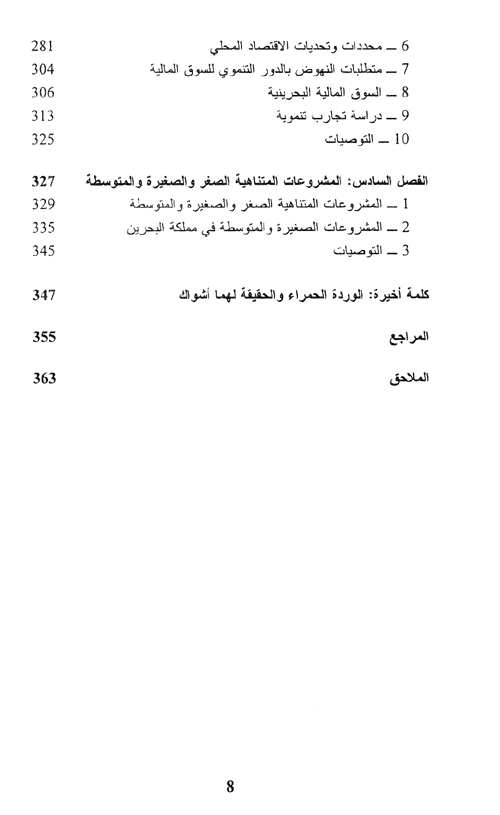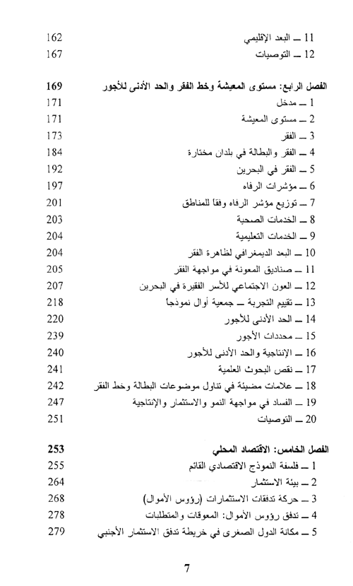 كما يتناول مسألة الاقتصاد البحريني في هيكليته الكلية والجزئية والمحددات التي تحكم مؤشرات الاستثمار، بالإضافة إلى المكونات والتحديات التي تواجهه، وحاجته لتمثل تجارب المشروعات المتناهية الصغر والصغيرة والمتوسطة، في محاولة علمية جادة لاستشراف وتحديد معالم سيناريوهات المستقبل الذي تنتظره البحرين في مختلف مساراتها، ضمن حركة التحولات واستحقاقات العولمة، وما تفرضه من متطلبات وشروط ملزمة لتحقيق شراكة عالمية.