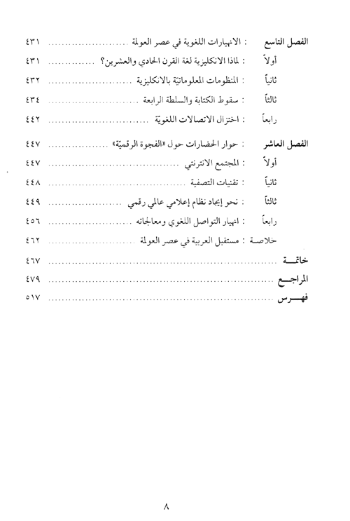 وتناول أيضاً موضوعات تؤكد سلطات اللغة الخاصة من أبعادها السياسية والدينية والاجتماعية. وحاول في اختصار كلي "عصر" مجمل الأفكار والنظريات والتسميات والاتجاهات التي تطرقت إلى مسائل الفصحى والعامية ووقوعها في مذاهب ومدارس كثيرة "لإصلاح" العربية.