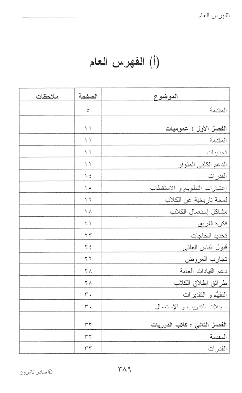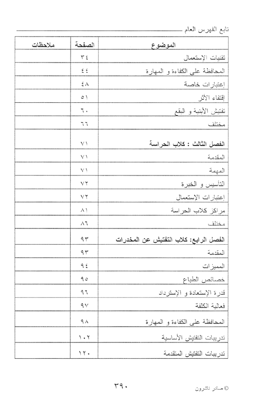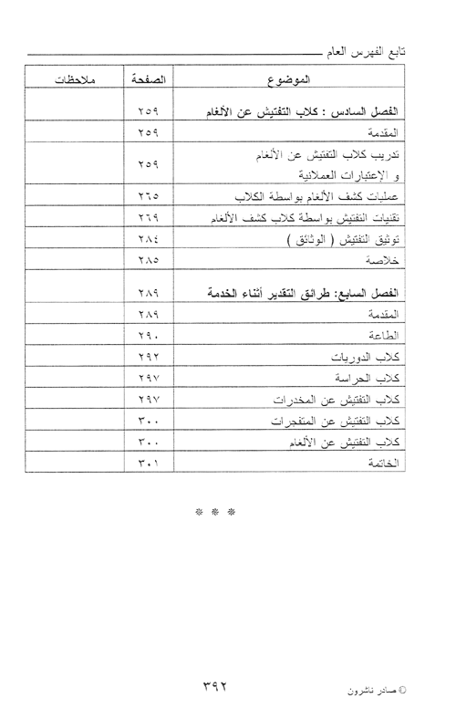 يليه الفصل الثاني، في كلاب الدوريات وقدراتها وتقنيات استعمالها في عمليات حفظ الأمن، وكيفية المحافظة على كفاءتها ومهارتها، وفي اقتفاء الأثر في مختلف الظروف المناخية وتفتيش البقع الهامة، وأمن وحماية الشخصيات.