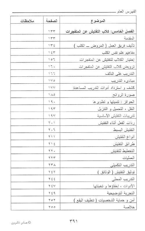 تدخل في طي الفصل الخامس الذي يتناول كلاب التفتيش عن المتفجرات، مبادئ اختيار وتدريب هذه الكلاب وكيفية تكوين صورة الرائحة في ذهن الكلب وكشف واسترداد أدوات التدريب المساعدة. ثم ذكر الحوافز وتنميتها. ثم تفصيل وشرح أنواع التفتيش وردات الفعل أثناء العمل، وتبيان طرائق التفتيش والتخطيط للعمل، وتنظيف البقع المشبوهة، وصولاً إلى أمن وحماية الشخصيات، فالختام بأهمية هذا النوع من الكلاب في مكافحة الإرهاب.
