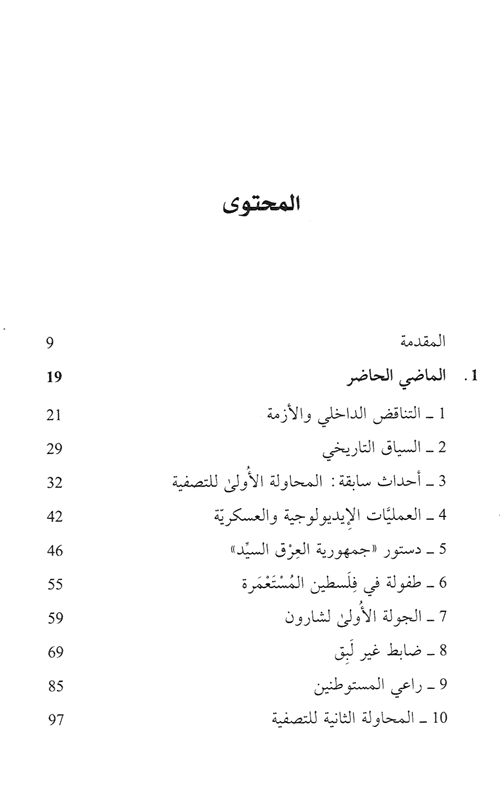 وفي هذا الكتاب أيضاً يصف الكاتب الأزمة المستمرة التي كانت ميزة متأصلة للدولة الإسرائيلية منذ سنة 1967 والتناقضات الإيديولوجية للجناح اليمني الإسرائيلي.نبذة الناشر:إن ما أعنيه بمصطلح "التصفية" هو العملية التي تهدف إلى مسح الوجود الفلسطيني كوحدة اجتماعية وسياسية واقتصادية. قد تعني هذه العملية، ولكن ليس بالضرورة، السحق الكامل أو الجزئي لهذا العرق من الأرض المعروفة باسم إسرائيل.