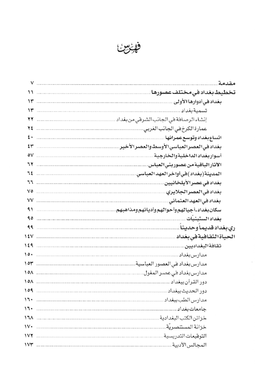 ويضمّ الكتاب مجموعة من الرسوم والصور التي جمعها المؤلف من كتب الرحالة الأجانب في العراق، بالإضافة إلى مجموعة من الصور التي تمّ عرضها في معرض يختص بالتراث البغدادي والتي رافقت تلك الرسوم والصور دراسة توزعت ضمن المحاور الآتية: 1-تخطيط بغداد في مختلف عصورها (بغداد في أدوارها الأولى، تسمية بغداد، إنشاء الرصافة، عمارة الكرخ، اتساع بغداد وتوسع عمرانها، بغداد في العصر العباسي الأوسط والعصر الأخير، أسوار بغداد الداخلية والخارجية، الآثار الباقية من عصور بني العباس، المدينة بغداد في أواخر العهد العباسي، بغداد في عصر الإيلخانيين والعصر الجلايري والعثماني، سكان بغداد أجيالهم وأحوالهم وأديانهم ومذاهبهم، بغداد الستينات)، 2-ري بغداد قديماً وحديثاً، 3-الحياة الثقافية في بغداد (ثقافة البغداديين، مدارس بغداد، دور القرآن والحديث في بغداد مدارس الطب في بغداد، جامعات بغداد، خزائن الكتب البغدادية، خزائن المستنصرية، التوقيعات التدريسية، المجالس الأدبية...)، 4-المراصد الفلكية ببغداد (خدمات الأسطرلاب، العملة والنقود البغدادية)، تراث الرسم البغدادي (نشأة التصوير الإسلامي في بغداد)، 5-العمارة البغدادية (المعالم المعمارية لبغداد في أواخر العصر العباسي، الأسواق والمقاهي والمحلات البغدادية والدور البغدادية والتراث السكني، البيئة النهرية، القباب والمنائر البغدادية، تحليل القوام الإنشائي للعمارة البغدادية)، 6-تطور فن العمارة في بغداد (المعالم التاريخية المعمارية في بغداد، البيئة المعمارية، التطور الحديث للعمارة في بغداد، الزخارف الآجرية، الأعمال الخشبية، أعمال الحديد، القاشاني)، 7-مدرسة بغداد للرسم (مدرسة فن التصوير الحديثة). إقرأ المزيد