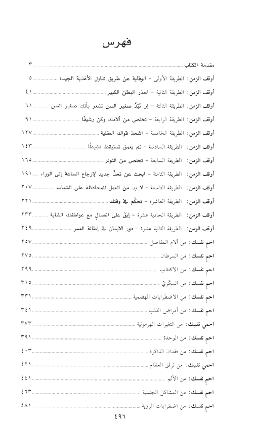 كما وستجد فيه طرقاً عملية لتخفيف خصرك، لمساعدتك على إزالة التجاعيد، لمنع فقدان الشعر، للالتزام بذاكرة قوية وبديهة سريعة. وطرقاً ماهرة وسهلة للقضاء على الأوجاع وعدم معاودتها. كما ستكتشف تحديات ومغامرات مصنوعة خصيصاً لتساعدك في الحفاظ على نظرة شابة، وطريقة خاصة في الصلاة لتغذي حياتك الروحية. ومع كل واحدة من هذه الوسائل، ستجد أبحاثاً تعرض مدى أهمية كل عامل. إقرأ المزيد