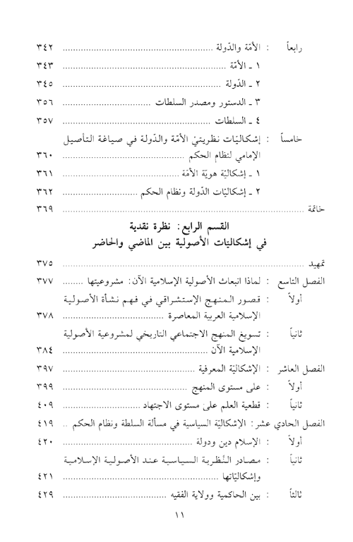 ولأن الأصولية تقدم مشروعها السياسي والفكري في إطار تحقيق التقدم الذي لا يعني مجاراة الأمم بما بلغته من أنماط في تنظيم المجتمع ووسائل إدارته، وما نجم من سلوكيات وأخلاق، بل ترى التقدم في بعث الإسلام في المجتمعات العربية، لذا حصرت الدراسة في تحليل عناصر الاجتماع بالمفهوم الأصولي، وعرض أفكار العدالة، وتحليل مفهوم الدولة، وعرض نظرية الحكم الإسلامي التي تدعو الأصولية إليها، لدرس الإشكاليات من زاوية النقد الإيجابي، وبالتالي استكشاف الأساليب التي يلجأ إليها الأصوليون المسلمون العرب على الصعيد الفكري لتجاوز المأزق الكبير المترتب على البعد بين النصوص الثابتة وقوانين العلم الجديدة والمتغيرة.