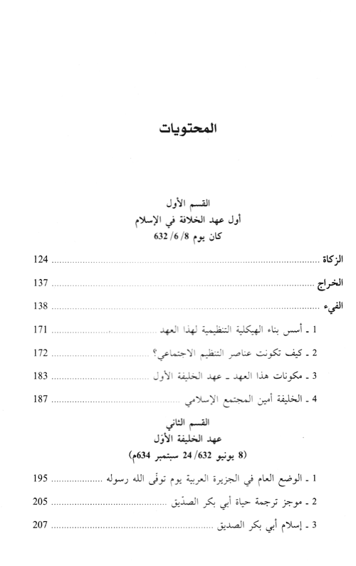 وإذا ما عدنا إلى أقسام هذا الكتاب نجد أنه يتألف من بابان: الباب الأول: يتحدث عن بداية عهد الخلاقة في الإسلام. ويشتمل على ثلاثة فصول، تناول الفصل الأول النقلة التاريخية الفريدة في التاريخ السياسي، وتأثير العوامل الاقتصادية والمناخية في البنية الاجتماعية وبيان هذه العناصر. ومصير هذه البنية بعد ظهور الإسلام. والعلاقات الخارجية للبلاد العربية قبل الإسلام وبعد.