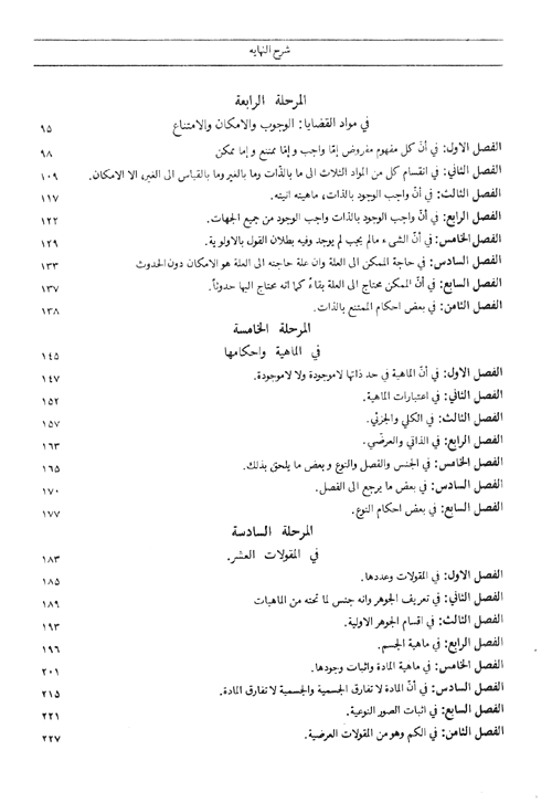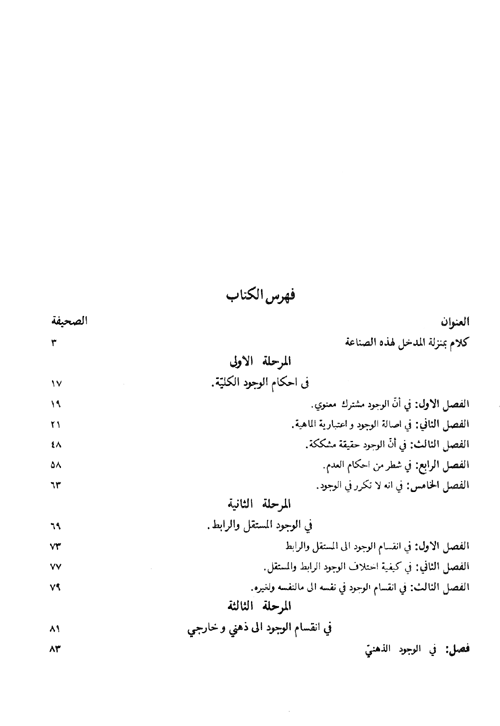 في هذا الإطار يأتي كتاب "نهاية الحكمة" للعلامة الفيلسوف محمد حسين الطباطبائي. وقد تمّ تقسيم المسائل المدونة فيه إلى قسمين. أحدهما: مسائل العلم الكلي أو الفلسفة الأولى الباحثة عن الأمور العامة أي المعقولات. الثانية الفلسفة (دون المنطقية) التي تختص بموجود معين بما هو خاصّ به، وموضوعه الموجود بما هو معروض تلك المعقولات، وغايته معرفة المبادئ التصديقية لسائر العلوم وخاصة العلم الإلهي، أي القسم الثاني من هذه المسائل المدوّنة، وكذا تمييز المعارف الحقيقية من الوهميات.