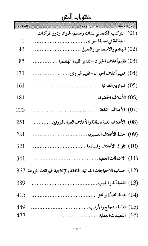 يتألف هذا المقرر من خمسة عشر وحدة، تتضمن في ثناياها بعض التطبيقات العملية لإثراء الجانبين: النظري والعملي، أما وحدات هذا المقرر فهي: الوحدة الأولى: التركيب الكيميائي للنبات وجسم الحيوان ودور المركبات الغذائية في تغذية الحيوان. الوحدة الثانية: الهضم والامتصاص والتمثيل. الوحدة الثالثة: تقييم أعلاف الحيوان-تقدير القيمة الهضمية. الوحدة الرابعة: تقييم أعلاف الحيوان-تقييم البروتين. الوحدة الخامسة: الموازين الغذائية. الوحدة السادسة: الأعلاف الخضراء. الوحدة السابعة: الأعلاف الخشنة. الوحدة الثامنة: الأعلاف الغنية بالطاقة والأعلاف الغنية بالبروتين. الوحدة التاسعة: حفظ الأعلاف العصيرية. الوحدة العاشرة: تلوث الأعلاف وفسادها. الوحدة الحادية عشر: الإضافات العلفية. الوحدة الثانية عشر: حساب الاحتياجات الغذائية الحافظة والإنتاجية لحيوانات المزرعة. الوحدة الثالثة عشر: تغذية أبقار الحليب. الوحدة الرابعة عشر: تغذية الضأن والمعز. الوحدة الخامسة عشر: تغذية الدجاج والأرانب.نبذة الناشر:التركيب الكيماوي وانواع الاعلاف، والهضم والتمثيل الغذائي للحيوانات المجترة، والمقررات الغذائية، وتجهيز الاعلاف وتقييمها، وطرق التغذية المختلفة. إقرأ المزيد