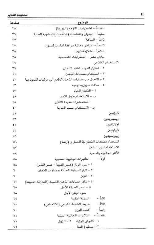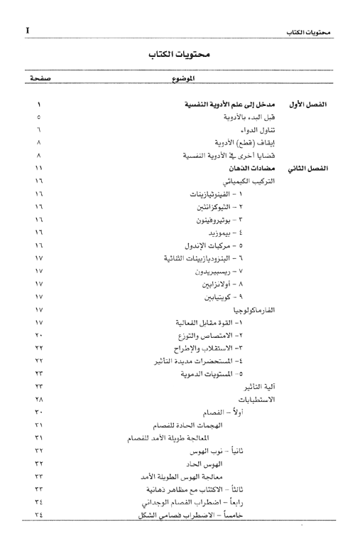 وقد كان أهم المواضيع التي ناقشها الكتاب: مدخل إلى علم الأدوية النفسية، مضادات الذهان، مضادات الاكتئاب، المثبطات الانتقالية لعودة التقاط السيروتونين، مضادات الاكتئاب ثلاثية الحلقات والمركبات المرتبطة بها، مثبطات أنزيم مونوأمين أوكسيداز، معدلات المزاج، فالبورات البنزوديازبينات ومزيلات القلق، المنبهات النفسية، مضادات الهيستامين، ضواد المستقبلات الأفيونية، وغيرها من المواضيع الهامة. إقرأ المزيد