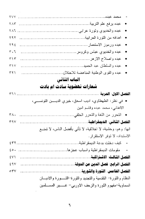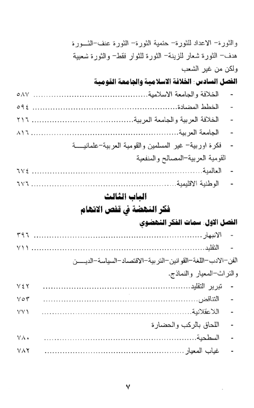 لتنتقل من ثم إلى الموضوع الثاني الذي تم فيه البحث في الشعارات النهضوية التي سادت ثم بادت من مثل شعار: الحرية (الطربطاوي، أديب اسحق، خير الدين التونسي، الأفغاني، محمد عبده، قاسم أمين)، التحرر من اللغة والتحرر الخلقي)، الديمقراطية، الإشتراكية، فصل الدين عن الدولة، الثورة والثورية، ثم وأخيراً ثم تخصيص الباب الثالث لمحاكمة فكر النهضة الذي تم تحديد سماته: الإنبهار، التقليد في مجالات: الفن، الأدب، القوانين، التربية، الإقتصاد، السياسة، الدين، التراث، المصادر، والنماذج.