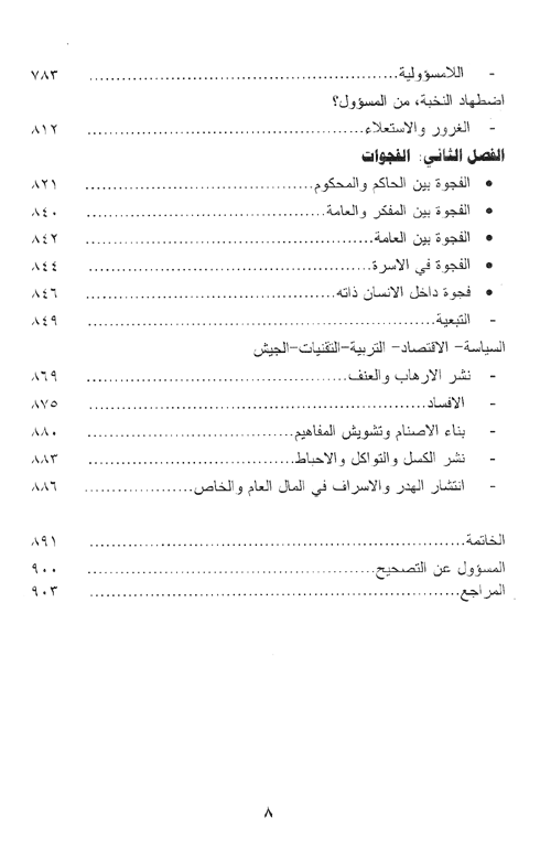 مبينة، وإلى هذا، التبرير الذي استعمل لهذا المنحى في التقليد ومن ثم لتكشف عن التناقض الذي وقع فيه هذا التقليد وعن لاعقلانية، وبأنه كان ومن منطلق اللحاق بالركب والحضارة غارقاً بالسطحية، ولا يملك أي معيار في ذلك ولا حتى أية مسؤولية، ولتكشف أيضاً عن الفجوات التي أحدثتها هذه النهضة أدائها أحدثت فجوة بين الحاكم والمحكوم، وبين المفكر والعامة، كما وعلى النطاق الأسري أحدثت هذه النهضة فجوات ضمن الأسرة بل وحتى داخل الإنسان ذاته، كما أنها كرست التبعية ونشرت الإرهاب وشكلت عاملاً من عوامل الإفساد وشوهت المفاهيم ونشرت الكسل والتواكل والإحباط، وساعدت على إنتشار الهدر والإسراف في المال العام والخاص.