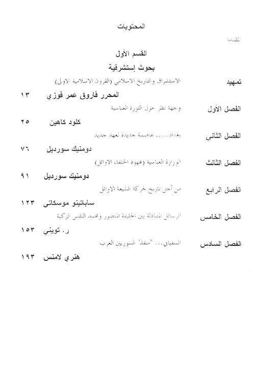 وبالعودة لمتن هذا الكتاب تجد أن مادته قد جاءت موزعة على قسمين القسم الأول ضم ستة فصول، أوضح "كلود كاهين" في الفصل الأول منها وجهة نظره في الثورة العباسية، ممهداً لذلك بذكر الحركات الدينية السياسية التي قامت باسم آل البيت، ومنتهياً إلى أن الثورة العباسية على عكس ما أشارت إليه الدراسات الاستشراقية السابقة له هي في واقعها ثورة قامت باسم الإسلام ومن أجل تحقيق مبادئه.