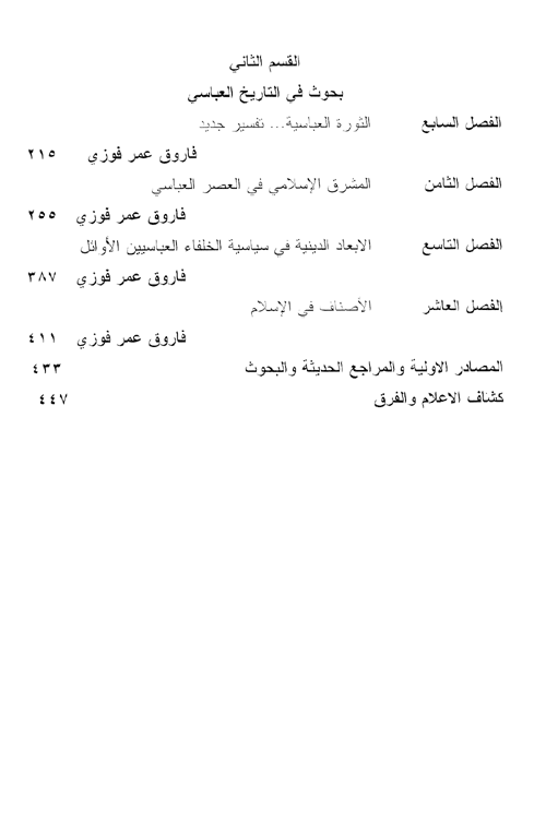 وفي القسم الثاني من الكتاب الذي ضم أربعة فصول، عرض فاروق عمر فوزي من أبحاثه الخاصة جملة حركات ومظاهر حضارية حيث ناقش الفصل السابع الثورة العباسية مؤكداً على تفسير جديد يختلف تماماً عن التفسير الاستشراقي المتداول والشائع في الأوساط العلمية والثقافية ومفاده أن القوة الضاربة في تلك الثورة كانت تتكون من العرب المقاتلة والمستقرين، من أهل خراسان ثم أهل العراق. أما الفصول الثلاثة الأخرى فقد عالجت مظاهر سياسية وثقافية وحضارية تؤكد دون شك بأن ذلك العصر كان عصر ازدهار حضاري بالمقارنة مع المجتمعات الأخرى، سادت فيه قيم ومثل ومؤسسات مدنية استجابت لحاجات المجتمع في تلك الفترة التاريخية. إقرأ المزيد