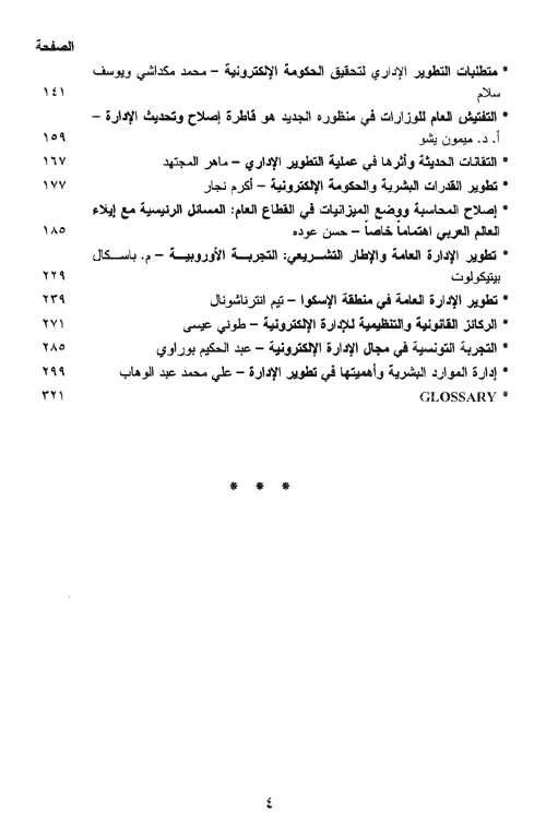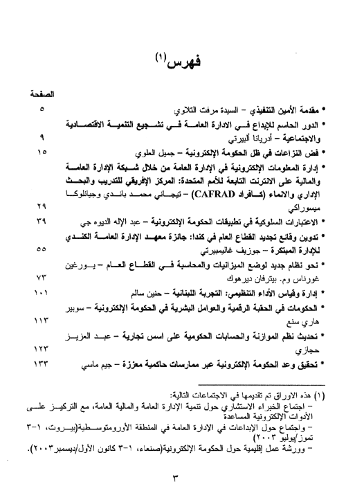 نبذة نيل وفرات:يلعب القطاع العام دوراً رئيسياً في ازدهار الدولة وتقدمها، إذ يتولى هذا القطاع الإشراف على إدارة المرافق الحيوية مثل الزراعة والصناعة والتجارة والمواصلات وغيرها من خلال الإجراءات الحكومية ذات العلاقة، وبالتالي فإن هذا القطاع هو العصب الأساس لأية جولة، وإذا روقب مسار الدول، يلاحظ أن تطورها أو تدهورها ينعكس ...دائماً على وضع الخدمات العامة فيها. وأهم المؤشرات التي تدل على مستوى القطاع العام في أية دولة: الشفافية، ومستوى البيروقراطية، وسرعة الإجراءات الإدارية وشموليتها وتسهيلاتها وفعالية القدرات البشرية، واللامركزية الإدارية، واعتماد الأساليب الإدارية الحديثة، واستخدام الأدوات العصرية اللازمة لتسهيل العمل الإداري وغير ذلك من مظاهر التطوير المستمر للخدمات الحكومية التي تعني المواطن كفرد والمجتمع ككل. وفي خطوة لتقييم وضع القطاع العام والخدمات الحكومية في المنطقة العربية وإبراز المشاكل الأساسية في هذا المجال، وإيجاد حلول تناسبي بيئة الإدارة العامة في المنطقة، نظمت إسكوا اجتماعين في هذا المجال: "اجتماع الخبراء الاستشاري حول تنمية الإدارة العامة والمالية العامة، مع التركيز على الأدوات الإلكترونية المساعدة" و"اجتماع حول الإبداعات في الإدارة العامة في المنطقة الأورومتوسطية" في بيت الأمم المتحدة في بيروت بين 1 و3 تموز/يوليو 2003. وقد شارك في تنظيم هذين الاجتماعين مكتب وزير الدولة لشؤون التنمية الإدارية في لبنان، وشعبة الإدارة العامة وإدارة التنمية في الأمم المتحدة، ومؤسس فريديرتش أبرت، وجمعية المعلوماتية المهنية في لبنان، وجمعية إنماء المعلوماتية القانونية في لبنان، وبرنامج الأمم المتحدة الإنمائية. وقد شارك في أعمال الاجتماعين خبراء من دول عديدة الذين تداولوا في هذين الاجتماعين المتزامنين شؤوناً عديدة متعلقة بالإدارة العامة في المنطقة العربية، ومن أبرز هذه المواضيع تطوير الموارد البشرية العاملة في القطاع العام وتدريبها على استخدام الأدوات الإلكترونية المسهلة للإجراءات الإدارية، وتبسيط تلك الإجراءات، وتخفيف البيروقراطية، وكان التأكيد على أن الهدف الأساسي من القطاع العام هو خدمة المواطن؛ وبالتالي لا بد من خلق المناخ الملائم لتحديث القطاع العام وفقاً لمفاهيم أثبتت فاعليتها ويجب العمل على تطويرها باستمرار لمواكبة العصر وحاجات المواطن بشكل أفضل. وكنتيجة لهذين الاجتماعين، وبطلب من الحكومة اليمنية، نظمت اسكوا ورشة عمل بعنوان "ورشة عمل إقليمية حول الحكومة الإلكترونية"، عقد في مدينة تكنولوجيا الاتصالات والمعلومات في صنعاء في فترة 1 إلى 3 كانون الأول/ديسمبر 2003. وبناء للطلب المتكرر على الأوراق التي قدمت في هذه الاجتماعات، والفائدة المرجوة من تعميم الأفكار والمبادئ الواردة فيها، فقد تم نشر هذه الأوراق في هذا الكتاب وذلك بعد تنقيحها وترجمة ما يلزم إلى اللغة العربية. وقد حرصت اسكوا على تقديمها إلى الجمهور الواسع نظراً لقيمتها العملية المتوقعة في المنطقة العربية، على أمل أن يكون هذا الكتاب في خدمة الحكومات والخبراء العاملين في ميدان التطور الإداري. إقرأ المزيد