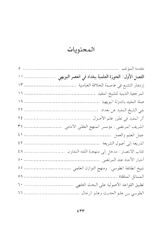 هذا ويتوزع البحث في فصول ستة: تضمن الفصل الأول "الحوزة ...العلمية ببغداد" دراسة التطور العلمي لبداية نشوء مرجعية الفقهاء منذ عهد الشيخ المفيد (ت:413هـ/1022م)، حتى نهاية عهد الشيخ الطوسي (ت:460هـ/1064م).