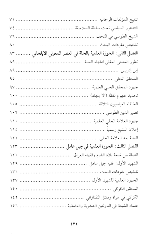 كما تضمن الفصل الثاني "الحوزة العلمية بالحلة" دراسة تطور النهضة العلمية على يد فقهاء الحلّة، وعلاقة المؤسسة الدينية بالحكم المغولي للعراق، وتأثير فقهاء الإمامية على قادة هذا الحكم فكرياً وعقائدياً كما هو السائد في نصوص الدراسات.