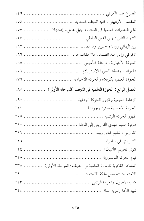 أما الفصل الخامس "الحوزة العلمية في النجف" (في مرحلتها الثانية) فقد استقرأ جهود فقهاء النجف منذ قيام العهد الجمهوري عام 1958م حتى أوائل التسعينيات الميلادية.