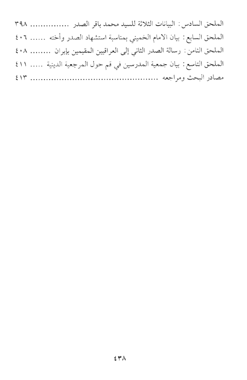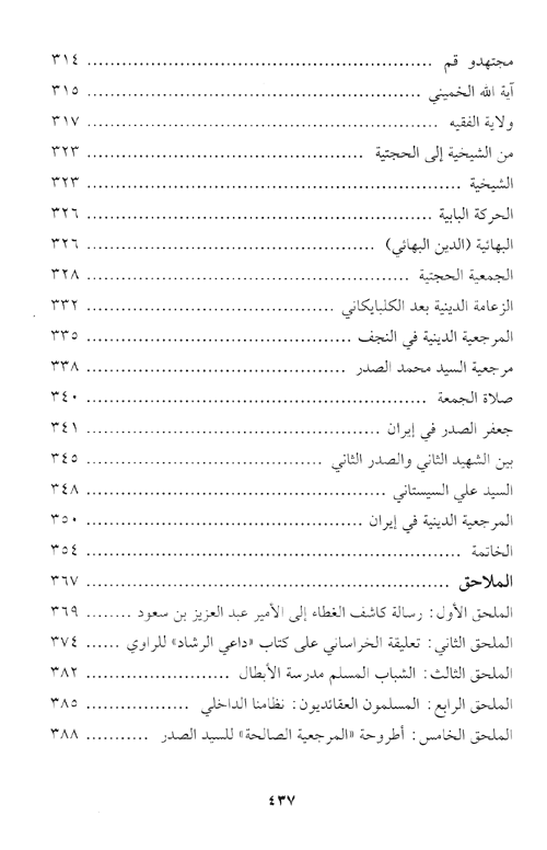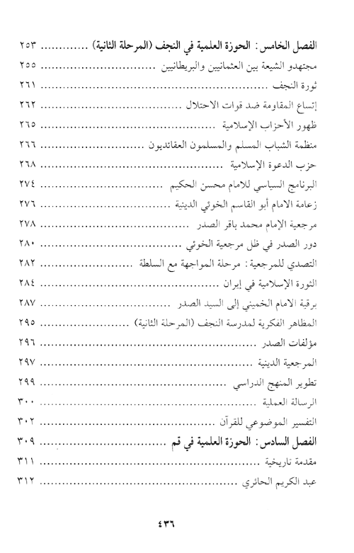 وتناول الفصل السادس "الحوزة العلمية في قم" دراسة تطور هذه المدينة تاريخياً، مركزاً على دور الشيخ عبد الكريم الحائري اليزدي (ت:1355هـ/1936م)، في تخريج نخبة من المجتهدين ساهموا في صياغة تاريخ هذه الحاضرة صياغة جديدة أمثال الأمام الخميني. إقرأ المزيد