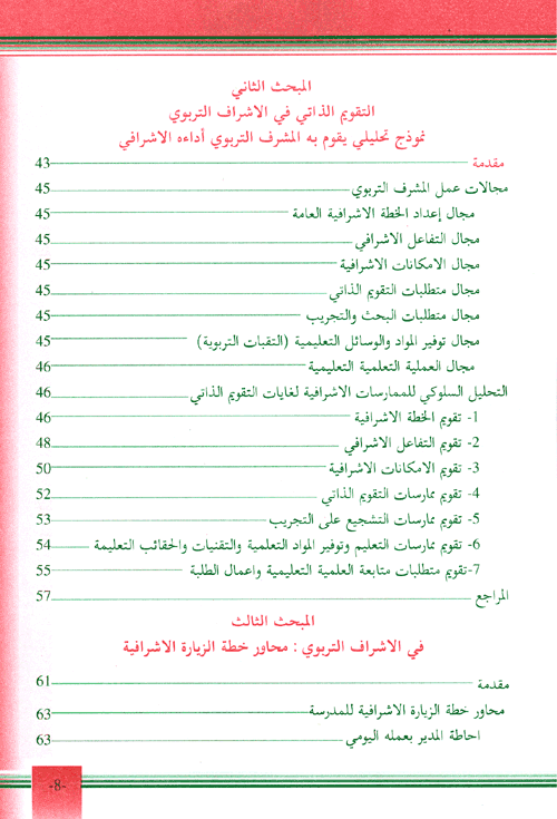 وقد جاء الكتاب ثمرة لدراسات مكثفة وخبرة ملتزمة ومنفتحة على الاتجاهات الحديثة في موضوعه وفي بنائه ولعله يشكل إضافة عملية ونظرية إلى مرجعيات العملية التربوية وغلى خطوطها التنفيذية فيما يتعلق بالتدريس، والتعلم والإدارة والإشراف وبالبحث العلمي والتقويم الذاتي في المجالات التربوية.