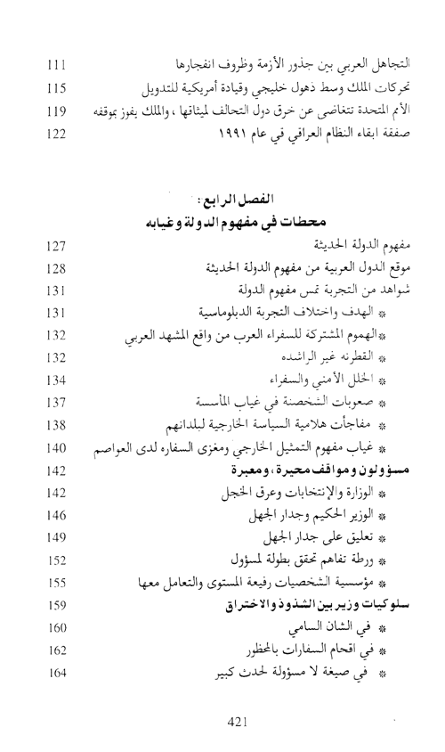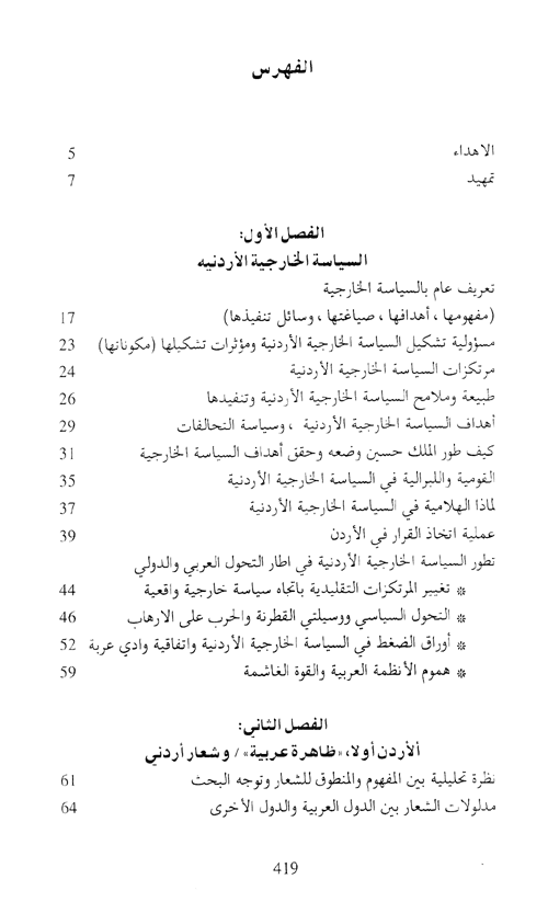 السياسة الخارجية الأردنية: تشكيلها، وأهدافها، ومرتكزاتها، ومكوناتها، وتطورها، ووسائل تنفيذها، وكيفية صنع القرار، وكيف تمت مزاوجتها، في فترة ما، بسياسة داخلية معينة نجحت في خلق معادلة بديلة عن الديمقراطية في تمكين النظام من النجاة بنفسه وبالدولة، وتطوير وضعه إلى مجرد صديق للعالم الغربي، وامتلاكه هامشاً في حرية القرار. لكن ذلك كان حتى نهاية الثمانينات حين استجابت الأنظمة العربية إلى متطلبات السياسة الخارجية الأمريكية الواقعية، وطوّرت سياساتها تبعاً لذلك باللجوء إلى القطرنة غير الراشدة، والتحالف ضد الإرهاب.