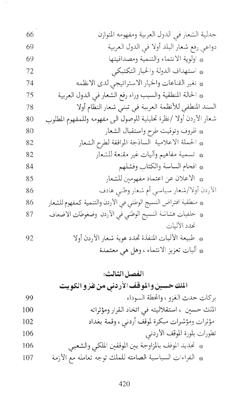 شعار "الأردن أوّلاً" كظاهرة عربية نشطت في نهاية الثمانينات في إطار شعار "البلد أولاً"، وتسارعت وتيرتها في توقيت مشبوه -في التسعينات، ويعرج الكاتب بهذا على واقع الأردنيين من ذوي الأصول الفلسطينية في الأردن، من خلال المفهوم المطروح للشعار، وفيما إذا استطاعت الحكومات إثبات جدية المفاهيم المعلنة للشعار، وصحة الآليات المسماة لتنفيذه، وفيما إذا كان شعاراً وطنياً هادفاً، أم أداة من أدوات التحوّل في السياسة الخارجية.