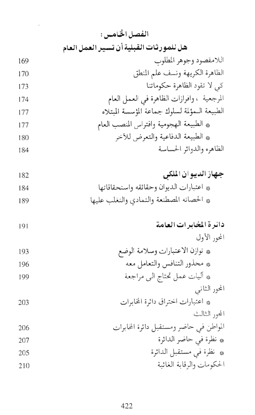 استعراض للانحدار الاجتماعي، والسياسي، والمؤسسي في ...الأردن، والتراجع في فهم فكرة الدولة الحديثة وفلسفتها تراجعاً تجسد في انبعاث الموروثات القبلية المتناقضة مع مفهوم الدولة الحديثة في ذهنية المواطن الأردني، وانعكاسها مع أدبياتها في أجهزة الدولة والعمل العام، وفي تغيير وسائل التنفيذ في السياسة الخارجية والداخلية وطبيعته، والعزوف عن استخدام الأوراق الضاغطة، وهو بهذا يتناول أداء أجهزة الدولة وتقييمها، ويأخذ نماذج حساسة منها، كجهاز الديوان الملكي، ودائرة المخابرات العامة.