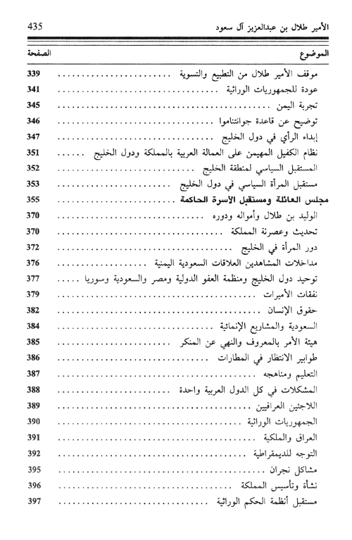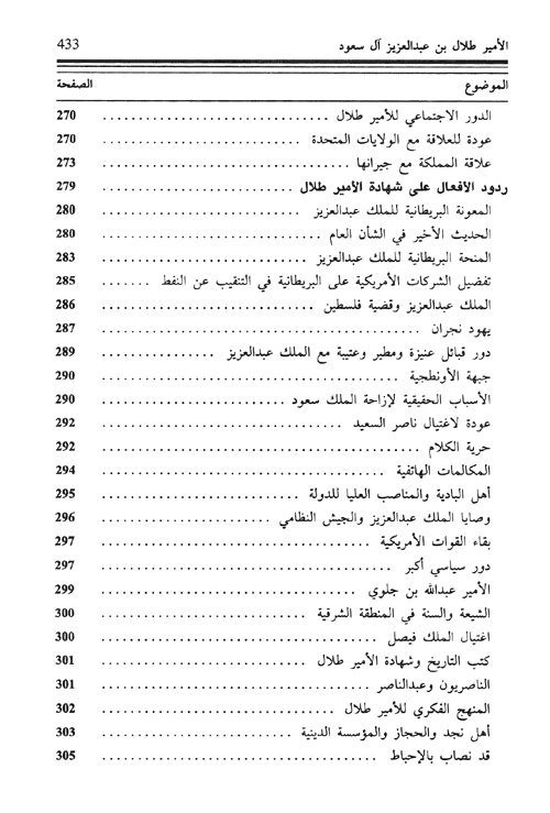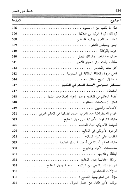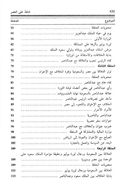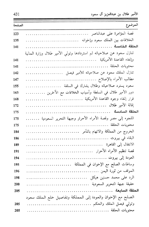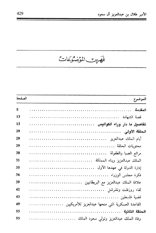 من هنا يمكن القول بأن الأمير طلاب بن عبد العزيز كان في شهادته هذه شاهداً هاماً وشخصية لها بصماتها المميزة في التاريخ السعودي. وقد تمّ تحويل هذه الشهادات من نص مشاهد إلى كتاب مقروء وفي ذلك فائدة للمشاهد والقارئ معاً، حيث كانت قناة الجزيرة السباقة والرائدة في هذه الفكرة. في الفصل الأول من هذا الكتاب يروي أحمد منصور قصة هذه الشهادة وما دار وراء الكواليس بينه وبين الأمير طلال على مدى عام ونصف، وهي قصة مثيرة بكل تفاصيلها. وفي الحلقة الأولى يدلي الأمير طلال بشهادته فيها على مرحلة الطفولة والصبا في حياته، متحدثاً عن الأيام الأولى لقيام المملكة العربية السعودية وما رافق تلك الرحلة من أحداث وفي الحلقة الثانية يدلي الأمير طلال بشهادته حول جوانب عديدة من أهمها أنه يستكمل في وصف يوم حياة الملك عبد العزيز، وعن توليه الوزارة لأول مرة وغيرها من الأحداث التي مرت به. وفي الحلقة الثالثة يدلي الأمير طلال بن عبد العزيز بشهادته بشكل مختصر على الفترة بين عامي 1958-1964 حيث كان لقاؤه الهام مع عبد الناصر عام 1958. أما في الحلقة الرابعة يتحدث الأمير طلال بشيء من التفصيل حول محاور وأحداث هامة سبق أن تحدث عنها باختصار. وفي الحلقة الخامسة يدلي الأمير بشهادته حول مواضيع هامة وعديدة في تاريخ المملكة الحديث. وفي الحلقة السادسة يتحدث الأمير على فترة هامة حيث يقيّم فترة مشاركته في السلطة كوزير للمالية. وفي الحلقة السابعة يدلي الأمير طلال بشهادته حول وساطات الصلح التي قام بها بعض الوسطاء من أجل عودته إلى السعودية. وفي الحلقة الثامنة يدور حديث الشهادة حول هزيمة يونيو عام 1967 وأثرها على المملكة العربية السعودية والواقع العربي بشكل عام، وعن أحداث أيلول الأسود وأثرها على القضية الفلسطينية وعن غيرها من المحاور الهامة في تلك الفترة. أما في الحلقة التاسع فيدلي الأمير طلال بشهادته حول مواضيع مختلفة منها مستقبل النفط وعن مقتل الملك فيصل وملابساته ودوافع القاتل وحول غيرها من المواضيع. بعد ذلك أجرى أحمد منصور حوارات أخرى مع الأمير طلال اعتبرها متمّمة لما دار في الشهادة وألحقها في هذا الكتاب. إقرأ المزيد