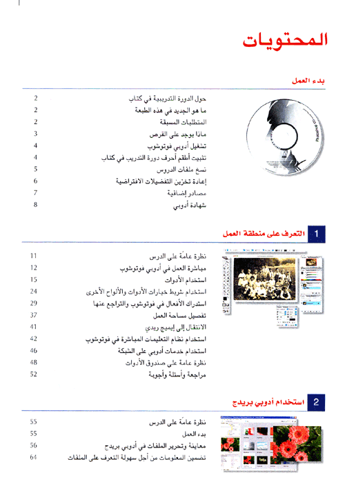 "أدوبي فوتوشوب سي إس 2 - دورة تدريب في كتاب" يتضمن ستة عشر درساً. وهذا الكتاب يغطي الأساسيات الرامية إلى تعلّم استخدام فوتوشوب، كما يحتوي على الكثير من الأفكار والنصائح والتقنيات التي تساعدك على أن تصبح بسرعة من المحترفين في استخدام فوتوشوب.