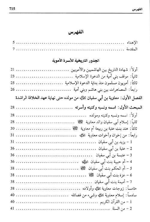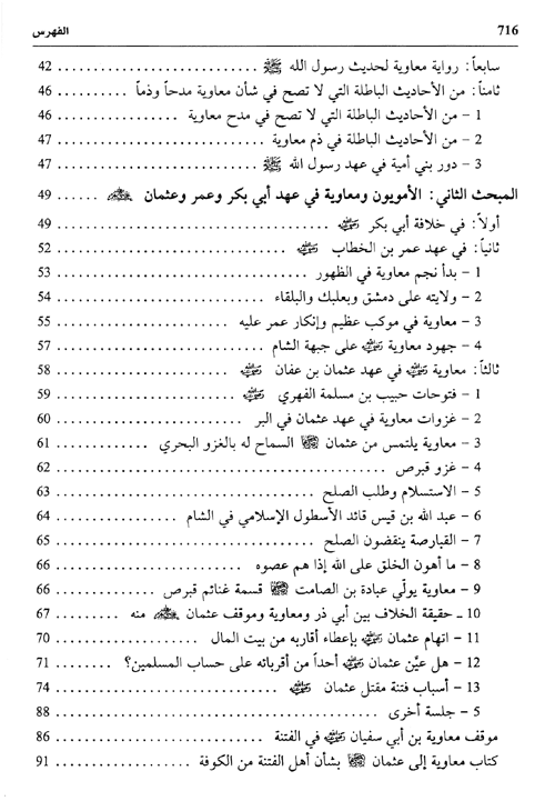 وتحدث عن مؤسسة الولاة والإدارة في عهد معاوية رضي الله عنه وأهم الأقاليم التابعة لدولته وأسماء أشهر ولاته وأهم أعمالهم في تلك الأقاليم، وعندما تحدث عن المدينة النبوية وترجم لشخصية أبي هريرة رضي الله عنه. هذا وقد وصف حركة الفتوحات في عهد معاوية رضي الله عنه، وقدم بين يدي حركة الفتوحات مقدمة تناقش الشبهات التي ألصقت بها كذباً وزوراً وبهتاناً.
