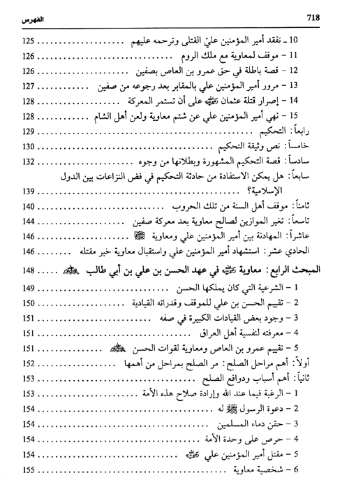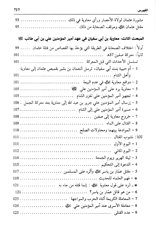 ويتحدث عن مشورة عثمان لولاة الأمصار ورأي معاوية في ذلك، وعن مقتل عثمان وموقف الصحابة منه، وعن معاوية في عهد علي بن أبي طالب رضي الله عنه، ويتطرق الكتاب إلى اختلاف الصحابة في الطريقة التي يأخذ بها القصاص من قتلة عثمان، وغلى معركة صفين إلى تسلسل الأحداث، ابتداءً من إرسال أم حبيبة أم المؤمنين بنت أبي سفيان للنعمان بن بشير بقميص عثمان إلى معاوية وأهل الشام، ودوافع معاوية رضي الله عنه في عدم بيعة علي رضي الله عنه، ورده على أمير المؤمنين علي، وعن تجهيز أمير المؤمنين علي لغزو الشام، وإرساله جرير بن عبد الله إلى معاوية بعد معركة الجمل لدعوته للبيعة، ومسيرة أمير المؤمنين علي إلى الشام ، وخروج معاوية إلى صفين، وبداية المناقشات بين الطرفين، والموادعة بينهما ومحاولات الصلح ثم نشوب القتال ثم الدعوة إلى التحكيم، ويتكلم الكتاب عن مقتل عمّار بن ياسر رضي الله عنه، وأثره على المسلمين، وعن المعاملة الكريمة أثناء الحرب المواجهة، ومعاملة الأسرى عند أمير المؤمنين علي رضي الله عنه، وعن عدد القتلى، وعن تفقد أمير المؤمنين علي للقتلى وترحمه عليهم، وعن موقف لمعاوية مع ملك الروم في تلك الأحداث، وعن قصة باطلة في حق عمرو بن العاص بصفين، ولعن أهل الشام، وعن التحكيم، وعن نص وثيقة التحكيم، وعن قصة التحكيم المشهورة وبيان بطلانها، وعن حقيقة قرار التحكيم، ومكان انعقاد المؤتمر، وأشار الكتاب إلى إمكانية الاستفادة من حادثة التحكيم في فض المنازعات بين الدول الإسلامية، هذا وقد بين موقف أهل السنة والجماعة من تلك الحروب، وتكلم عن تغيير الموازين لصالح معاوية بعد معركة صفين، وعن المهادنة بين أمير المؤمنين علي ومعاوية رضي الله عنهما، وعن استشهاد أمير المؤمنين علي واستقبال معاوية خبر مقتله.