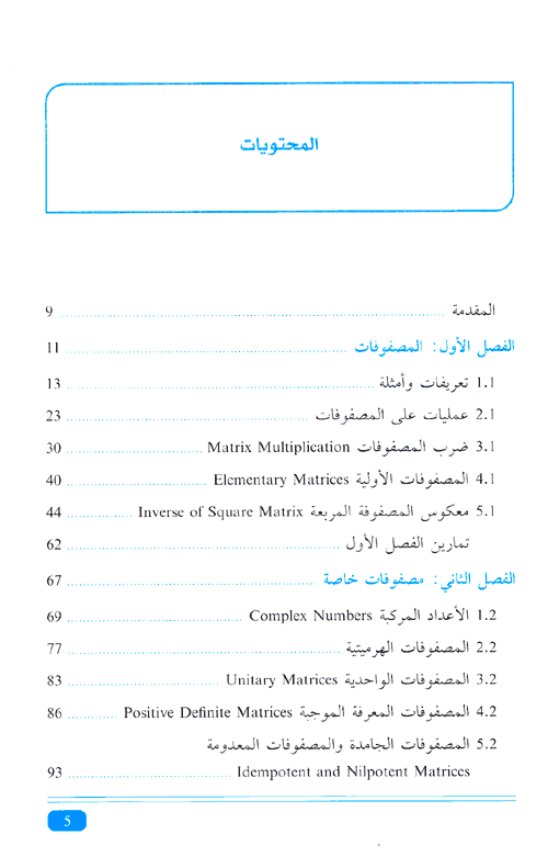 نبذة الناشر:المصفوفات لغة وأداة رياضية مهمة لها دور بارز، فهي العامل المشترك في الكثير من التطبيقات الرياضية، الفيزيائية، الهندسية، الكيميائية، الإحصائية، الاقتصادية،... الخ.