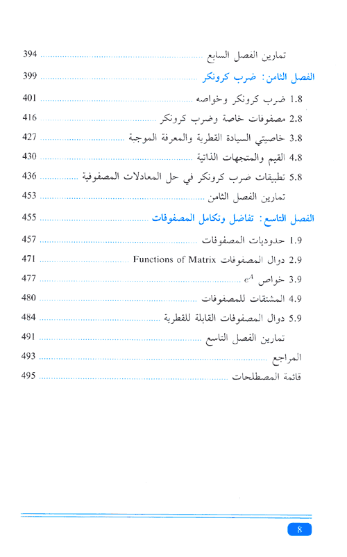 ظهر العديد من المفاهيم المصفوفية الحديثة خلال العقدين الأخيرين من القرن العشرين والتي تواكب الحاجة الماسة لهذه الأفكار، ومنها ضرب كرونكر الذي عرض في الفصل الثامن من هذا الكتاب، كما تم التطرق إلى تطبيقات ضرب كرونكر في العديد من المسائل المختلفة.