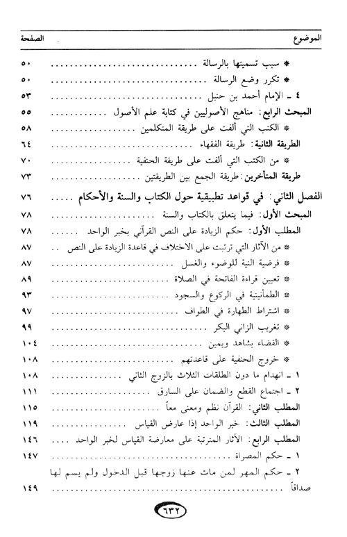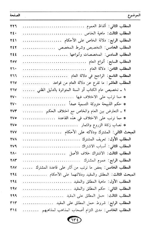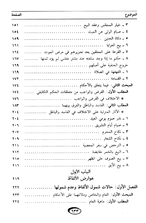 الباب الأول: عوارض الألفاظ. ويشتمل على فصلين: الفصل الأول: حالات شمول الألفاظ وعدم شمولها، ويشتمل على ثلاثة مباحث: المبحث الأول: الخاص والعام ودلالتهما على الأحكام، ويشتمل على عشرة مطالب: المطلب الأول: ماهية العام. المطلب الثاني: ألفاظ العموم. المطلب الثالث: ماهية الخاص. المطلب الرابع: دلالة الخاص على الأحكام. المطلب الخامس: التخصيص وشرط المخصص. المطلب السادس: المخصصات وأنواعها. المطلب السابع: أنواع العام. المطلب الثامن: دلالة العام. المطلب التاسع: الراجح في دلالة العام. المطلب العاشر: القواعد المتفرعة من دلالة العام.