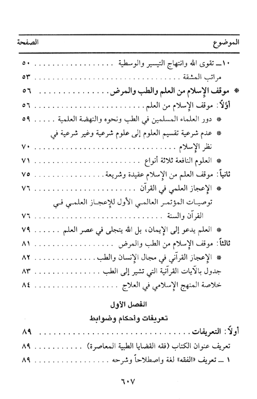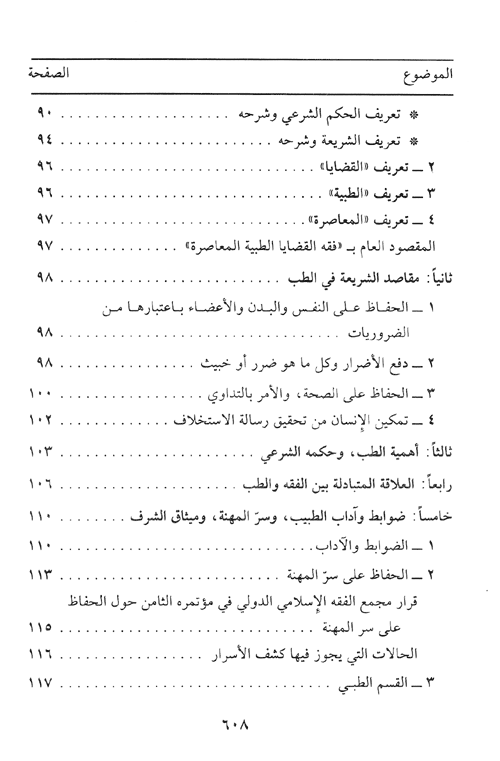 ومن القضايا التي عرض لها هذا الكتاب نذكر: التلقيح بين الزوجين بعد الموت، النظر إلى الجنس الآخر في التداوي، الاستنساخ الخلوي، أو العضوي، البصمة الوراثية من منظور الفقه الإسلامي الفحص الطبي قبل الزواج ودوره في الوقاية من الأمراض من منظور الفقه الإسلامي، الاستحالة والاستهلاك ودورها في التطهير والحل، تجميل الأعضاء بتغيير هيئتها، الوشم، زرع الشعر ومعالجته، إزالة شعر الوجه أو الحاجبين، زرع الغدد التناسلية، إجهاض الجنين المشوه، تحديد النسل وغيرها من الموضوعات. إقرأ المزيد