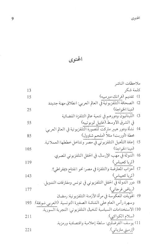 حيث عملت كل من الباحثة "دينا الخواجة وثريا كعيباس" على حصر وفهم -من منظورين مختلفين- المنطق الذي ساد إعادة تركيب المجال التلفزيوني في مصر، من خلال تحليل دور الدولة في هذه العملية، وهو أمر قاد أيضاً خطوات رياض فرجاني في ما يتعلق بالتجربة التونسية، حيث تبين "أن الدولة هي الضابط الأساس لتأميم الشأن الدولي". كما تقوم ثريا كعيباس، في مساهمة ثانية، بالتوقف عند مسألة المجال العام السياسي، من خلال المساحة المتاحة، على مختلف القوات التلفزيونية المصرية، لأحزاب المعارضة، من خلال تحليل خطابها المتعلق بتبدلات الحقل التلفزيوني اليوم.