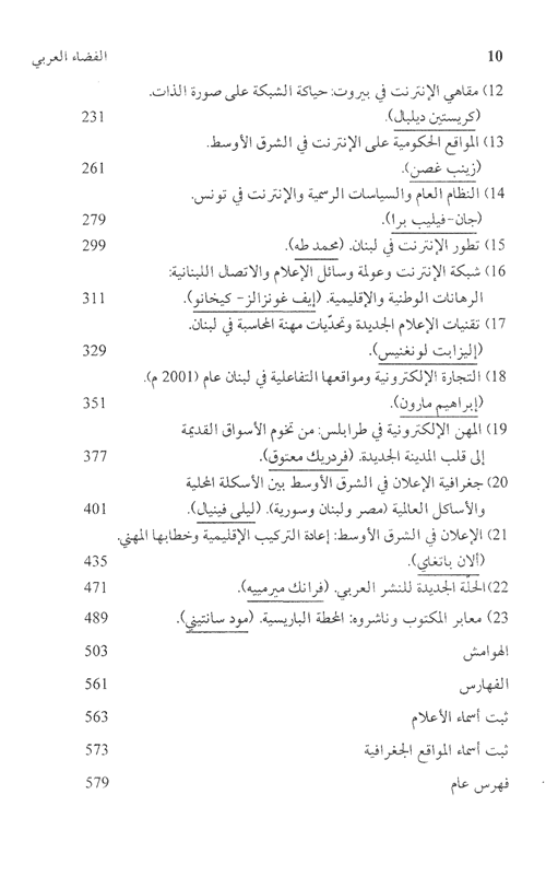 ويعود تأخر تطور (الإنترنت) في البلدان العربية إلى التبعية التقنية وعدم التأهيل الفني في ربط جماهير المستخدمين بالشبكة العالمية. ويقوم محمد طه هنا برسم المسار التاريخي لهذه العملية في لبنان، في حين يقوم إبراهيم مارون بدراسة عن التجارة الإلكترونية في لبنان من خلال متابعته لخصائصها وأبرز العوائق التي تعترض سبيلها وتطورها. وفي الإطار نفسه تقوم إليزابت لونغنيس، بعرض حالة مهنة المحاسبة والتحديات التي تفرضها عليه تقنيات الإعلام الجديدة والتجانس العالمي المتزايد لمعايير المهنة. أما إيف غونزاليس-كيخانو فيقوم بتحليل إعادة تشكل المشهد الإعلامي والاتصالي اللبناني من خلال متابعته لتطور الصحافة على (الإنترنت) والدور الإقليمي الذي يمارسه اللبنانيون على الساحة الإعلامية العربية.