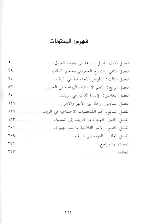 كما يعرض المؤلف لبعض العلاقات الإنسانية فيما بين الفلاحين وحالات التفاعل داخل العمليات الزراعية للسنوات التي سبقت قيام ثورة 14 تموز 1958. وفي معرض حديثة عن أصل الزراعة في جنوب العراق. يشير إلى أن الحياة الزراعية في الجنوب العراقي مرت بثلاث مراحل في مجرى تقدمها، أولاها تبدأ في أوائل عهد استيطان السومريين الأصليين وتوطيد حياتهم الزراعية البدائية في منطقة الأهوار، وفيما يتعلق بمصادر هذه الدراسة فقد ذكر المؤلف أنها جاءت عن طريق معايشته الميدانية لبعض الأقسام الجنوبية من الريف العراقي، وكذلك من مقابلاته الشخصية مع كبار السن الذين عاصروا الريف وهاجروا إلى المدن. إقرأ المزيد