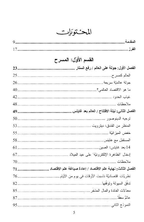 ويوضح أوهمي سبب انهيار نظريات الاقتصاد السابقة، ويلقي الضوء على عالم جديد تقوده "الدولة الإقليمية" والبرامج ...الاقتصادية الجديدة وليس الدول التقليدية أو علوم الاقتصاد التقليدية. كما يقدم رؤى ثاقبة حول تأثيرات التعقيدات التي لا سابق لها... وحول مراكز العمل المستقبلية الجديدة ومراكز النمو الجغرافية... وحول نشوء مجتمعات الإنترنت العالمية "لمستخدمي الإنترنت"، ودور القادة في عالم بلا حدود فعلياً.