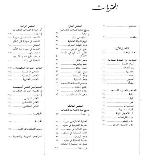 يشير عنوان هذا الكتاب إلى نية البحث في عمارة المساجد العثمانية، وقد قدم المؤلف كتابه بلمحة عن أقسام عمارة المساجد وعناصرها، ثم ابتدأ في الفصل الثاني حديثه عن بداية المساجد العثمانية وعن أثر الطابع البيزنطي في المرحلة الانتقالية، ونجاحه في اقتباس القباب التي تغطي حرماً واسعاً مع تحاشي الأعمدة الحاملة التي تفسد رحاله الفضاء الداخلي للحرم.