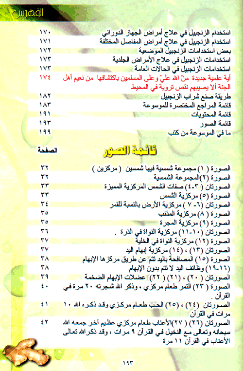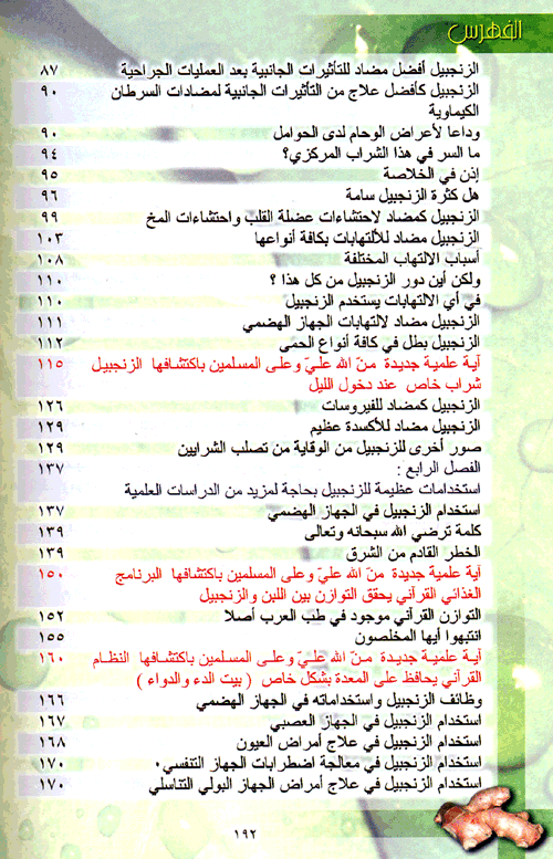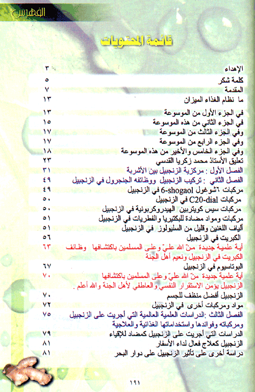 وقام بعد ذلك بجمع كل أحاديث رسول الله صلى الله عليه وسلم من الكتب التسعة (البخاري، ومسلم، والترمذي، والنسائي، وابن ماجة، وأبي داود، ومالك، وأحمد، والدرامي) التي تتحدث عن الزنجبيل وشرابه ومزاجه، فوجدت أنها حديث واحد ولكن ورد في كتب متعددة، ثم قام بعد ذلك بإجراء دراسة علمية ضخمة موسوعية تحليلية عن تركيب الزنجبيل وشرابه ومزاجه من كافة النواحي الغذائية والعلمية حيث سترونها مفصلة في جنبات هذا الكتاب. وركز عليه من الناحية التركيبة ومحتواها من كل عنصر من العناصر، وفوائد هذا العنصر وأين يعمل في الجسم وكيف يعمل وفوائده العلاجية واستخدامها، وكان كل ذلك مقروناً مع أحدث الدراسات العلمية العلمية التي أجريت على الزنجبيل وشرابه ومزاجه أو الدراسات التي أجريت على تأثير هذه المواد الموجودة في الزنجبيل وشرابه ومزاجه، وفوائده العظيمة.نبذة الناشر:هذا الكتاب لكل من يريدون أن يكونوا ذوي طاقة عالية ويتخلصوا من التعب المزمن والإرهاق ونقص الهمة وكثرة النوم والاكتئاب والوسوسة والفتور. ولكل من يريدون البقاء أصحاء وينعمون بحياة ملؤها الصحة والقوة والنشاط. ولكل من يعانون من ضنك العيش ويريدون توفير فواتير الأطباء والعلاج وأثمان العلاج وأثمان الطعام الذي غير خلق الله فيه. لكل من أراد أن يدرس جزء من علم التغذية والطاقة القرآني. للأطباء الذين يريدون أن يكتشفوا ما فاتهم من الحقيقة في علم الطب الحديث. لكل من يريدون أن يعرفوا ما ذكره القرآن في الزنجبيل وما ذكره رسوله صلى الله عليه وسلم فيه. لكل من يريدون أن يعرفوا سر الساعة البيولوجية التي وضعها القرآن للزنجبيل. لكل من يريدون معرفة فضل الزنجبيل على سائر الأشربة، لكل من يريدون الإستفادة من هذا الشراب العملاق في حياتهم. لمرضى الربو والحساسية، ولمرضى المفاصل واحتشاء عضلة القلب ولمرضى القولون والتهاب الجيوب الأنفية، لمرضى الضعف الجنسي ولمن يريدون أن ينظفوا أجسامهم جلدياً وكلوياً وكبدياً، ولمرضى الشقيقة ومرضى السرطان وغيرهم. لكل من يريدون معرفة التركيب الإعجازي الغذائي الذي اختصه الله سبحانه وتعالى في الزنجبيل. وأخيراً لأمة تريد أن تنهض بقوة وطاقة وصحة وجسم وفكر وعقل ونفس سليمة. بعلماء أفضل وطلاب أفضل وأمهات أعظم، الى هؤلاء وغيرهم يقدم هذا الكتاب من سلسلة أسس علم التغذية والطاقة الإسلامي. إقرأ المزيد