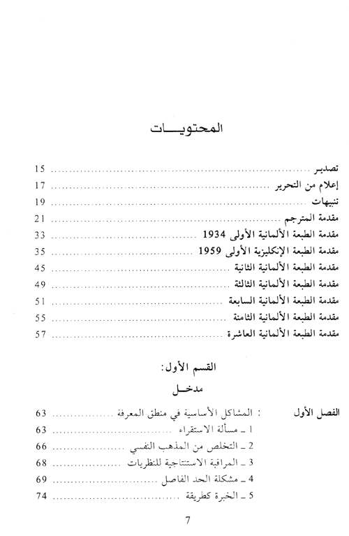 يجابه بوبر الاستقراء منذ الفصل الأول في كتابه هذا مجابهة لا هوادة فيها تكاد لا تنقطع في كل فقرة من فقرات الكتاب. فهو يرى بحق أن الاستقراء يجرّ مه تقهقراً لا نهاية له؛ أي سلسلة لا تنقطع من الأسئلة تثيرها الإجابات غير الشافية عن كل منها بدءاً بالسؤال الأول. إلى جانب ذلك عالج بوبر بإسهاب في الفصلين الثامن والتاسع نظرية الاحتمال وبعض مسائل الميكانيك الكمومي وأعاد جزءاً كبيراً من المشاكل الواقعة في تفهم الميكانيك الكمومي إلى عدم وجود نظمة موضوعاتية يبنى عليها حساب الاحتمالات بناءً جديداً وإلى عدم وضوح الرؤية في العلاقة بين الاحتمال والتجربة. كما أعطى للاحتمال تفسيراً موضوعياً يعتمد على التواتر النسبي رغم الصعوبات المنطقية التي تواجه هذا التفسير رافضاً التفسيرين الذاتي والمنطقي اللذين لها الطابع النفساني. إقرأ المزيد