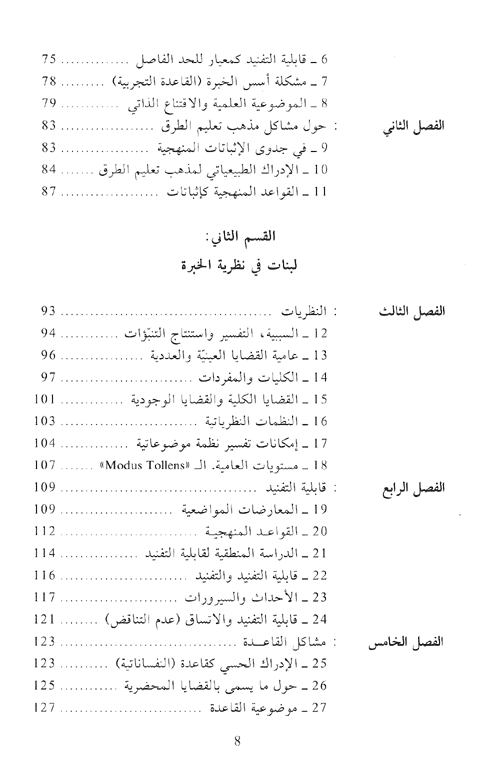 نبذة نيل وفرات:قرأ علميون كثيرون أيّاً كانت اختصاصاتهم في العلوم التجريبية لكارل بوبر وناقشوا نظرته للبحث العلمي، لمنطق هذا البحث وفلسفته ومنهجيته، وكذلك تكاد لا تجد فيزيائياً نظرياً واحداً على وجه الخصوص لم يطلع على كتابات بوبر، وعلى موقفه من الوضعيين، وعلى موقفه من المواضعاتيين خاصة وعلى رأسهم بوانكاريه، أو على ...مناقشاته لمشاكل الميكانيك الكمومي ولنظرية الاحتمالات الرياضية المرتبطة ارتباطاً وثيقاً بميكانيك الكم. وقد كان مترجم هذا الكتاب د.محمد البغدادي من بين هؤلاء الفيزيائيين النظريين الذين قرأوا بعض كتاباته قبل سنوات عديدة امتدت إلى عدة عقود. ثم جاء اقتراح المنظمة العربية للترجمة، ترجمة هذا الكتاب في طبعته العاشرة والأخيرة، المنقحة والمضافة الصادرة عام 1994، من الألمانية إلى العربية، وتمّ تكليفه بالقيام بهذا العمل الشاق والمجتمع في آن. ذلك أنه بغض النظر عن حجم الكتاب الكبير بفصوله العشرة وهوامشها المتعددة، المعدّلة والموسّعة على مدى ما ينوف عن نصف قرن، وبملحقاته التي ما فتئ يضيفها أو يعدل فيها وقد تجاوز الثمانين من العمر، فالكتاب مصوغ بلغات ثلاث إن صحّ التعبير؛ لغة الفلاسفة، ولغة المناطقة، ولغة العلوم البحتة، وتحديداً اللغة الرياضية-الفيزيائية، مما لا شك فيه أن بوبر من أشد أنصار الوضوح والبساطة في التعبير والكتابة، وأنه من ألدّ أعداء "التخصص" ولغة "المتخصصين" الجوفاء؛ ثم إنه أبعد ما يكون عندما يناقش عن الجدال في المصطلحات لأنه يرى كما كان الفيلسوف كانط يرى من قبله أن منشأ النزاع في الأمور، والفلسفية على نحو خاص، ليس نزاعاً حول الكلمات، إلا أنه إذا كان من مقتضيات البساطة الابتعاد عن اللغة "المتخصصة" المولعة بأكثر الكلمات غرابة وبعداً عن التداول؛ فإن من مقتضيات الوضوح أيضاً اختيار الكلمات بحيث لا تحمل أكثر مما يراد لها أن تقول وبحيث لا يدعو استعمالها إلى أي لبس. ينطلق بوبر في بناء نظريته في المعرفة وفهمه البحث العلمي من كون النظريات العلمية، التجريبية وغير التجريبية منها على حدٍّ سواء، ليست سوى مجموعة من الفرضيات والتخمينات، يقع على عاتق التجربة، على الوقائع المادية والقضايا المنطقية فحصها وتمحيصها ومراقبتها معززة لها تارة في حال صمودها أمامها أو على العكس، مفنّدة لها جزئياً أو كلياً تارة أخرى في حال دحضها من قبلها؛ ويقيم بذلك معياراً للحدّ الفاصل بين العلم والميتافيزياء التي لا تدحض وهكذا لم تعد التجربة ومعها الإدراك الحسّي والرصد مصدر المعرفة الأول والنقطة التي ينطلق منها العلم من الخاص إلى العام كما يرى منظّرو الاستقراء الذين يرجعون كلهم إلى أرسطو في نظره.