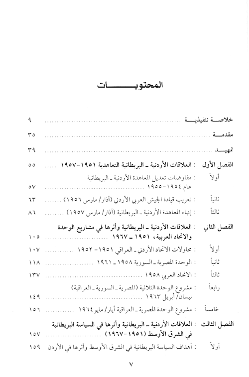 ويتناول الفصل الأول، العلاقات التعاهدية بين البلدين منذ عام 1951 إلى إنهاء معاهدة التحالف في آذار/مارس 1957، وذلك بإلقاء الضوء على محاولات تعديل المعاهدة والمفاوضات التي أجرتها الحكومة الأردنية عامي 1954 و1955 كم ـجل هذه الغاية، وتعريب قيادة الجيش العربي في آذار/مارس 1956، وما سبق هذا القرار من ظروف وأسباب أوجبت اتخاذه والنتائج التي ترتبت عليه. ثم التطرق إلى الظروف والأسباب والمفاوضات التي أجراها الطرفان من أجل هذه الغاية وقادت إلى إنهاء المعاهدة الأردنية-البريطانية في 13 آذار/مارس 1957.