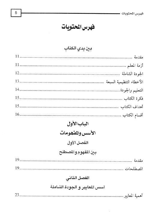 ولعل الحاجة لهذا الهدف الأخير واضحة إذ تتردد في ساحة التربية أسئلة كثيرة عن أساليب تطبيق مفهوم الجودة الشاملة في التعليم وآثار ذلك. وفي ضوء ما سبق أيضاً ينقسم الكتاب إلى بابين رئيسيين هما: الباب الأول: الأسس والمفهومات، الباب الثاني: النماذج والتطبيقات.نبذة الناشر:يهدف هذا الكتاب إلى مناقشة المفاهيم والأفكار المرتبطة بالجودة الشاملة ومحاولة التحديد الدقيق للمصطلحات التي قد تختلف حول بعض الأدبيات . وعرض أهم الاتجاهات العالمية المعاصرة في مجال الجودة الشاملة من حيث الأسس والمعايير والمواصفات القياسية التي يعتمد عليها تطبيق هذا المفهوم أو لاتخاذها منطلقا للحكم على ما توفر منها في المؤسسة التعليمية. بيان الأصول الإسلامية للجودة الشاملة ومقارنة هذا المفهوم في الثقافة الإسلامية . عرض أهم التجارب العالمية والعربية في مجال الجودة الشاملة في التعليم ومناقشة خطوات إعداد مشروعات الجودة الشاملة في عدد من الدول الغربية والعربية على مستوى كل من التعليم العام والتعليم العالي. إقرأ المزيد