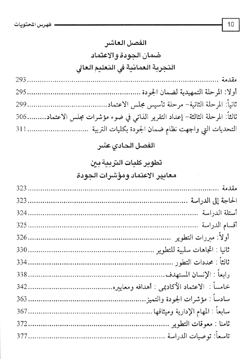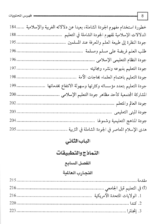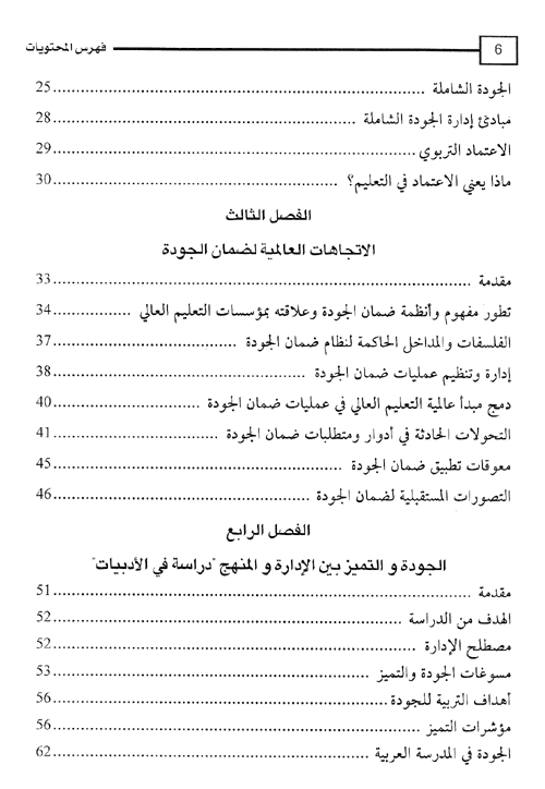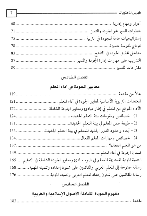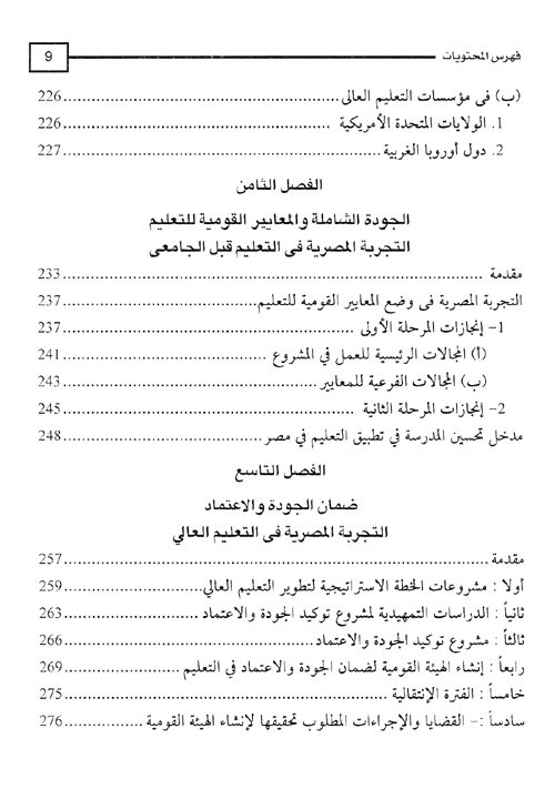إلى جانب هذا اهتم بعرض أهم التجارب العالمية والعربية في مجال الجودة الشاملة في التعليم ومناقشة خطوات إعداد مشروعات الجودة الشاملة في عدد من الدول الغربية والعربية على مستوى كل من التعليم العام والتعليم العالي.