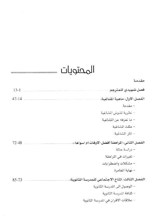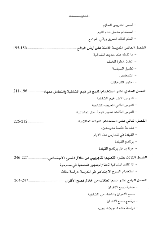 ويحتوي هذا الكتاب على خمسة عشرة فصلاً يتناول الفصل الأول منها مقدمة لفهم المشاغبة والتعرف على المشاغبين والضحايا والاختلاف بين الجنسين في ممارسة هذا السلوك، ويتناول الفصل الثاني مرحلة المراهقة ويتساءل فيها هل هي أفضل أوقات الحياة أم أسوأها سارداً لنا قصة ستة من التلاميذ تتباين فيهم تأثيرات هذه المرحلة، أما الفصل الثالث فخصص لوصف المناخ الاجتماعي للمدرسة الثانوية متناولاً لمفهوم الثقافة في المدرسة الثانوية.